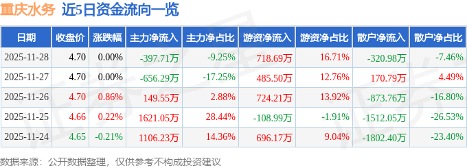 证券之星消息,截至2025年11月28日收盘,重庆水务(601158)报收于4.7元,上涨0.0%,换手率0.19%,成交量9.17万手,成交额4301.84万元。