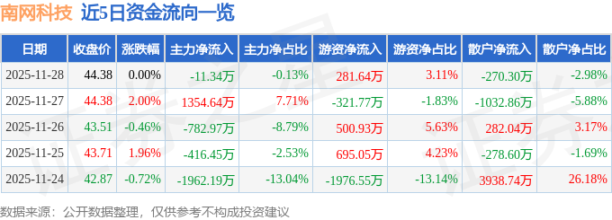 证券之星消息,截至2025年11月28日收盘,南网科技(688248)报收于44.38元,上涨0.0%,换手率0.9%,成交量2.06万手,成交额9069.07万元。