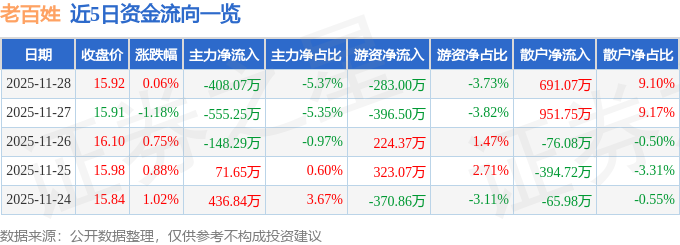 证券之星消息,截至2025年11月28日收盘,老百姓(603883)报收于15.92元,上涨0.06%,换手率0.63%,成交量4.78万手,成交额7592.55万元。