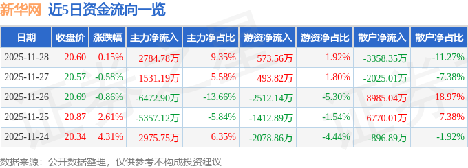证券之星消息,截至2025年11月28日收盘,新华网(603888)报收于20.6元,上涨0.15%,换手率2.15%,成交量14.51万手,成交额2.98亿元。