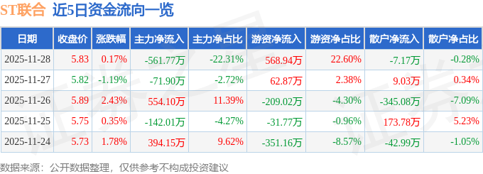 证券之星消息,截至2025年11月28日收盘,ST联合(600358)报收于5.83元,上涨0.17%,换手率0.86%,成交量4.32万手,成交额2517.68万元。
