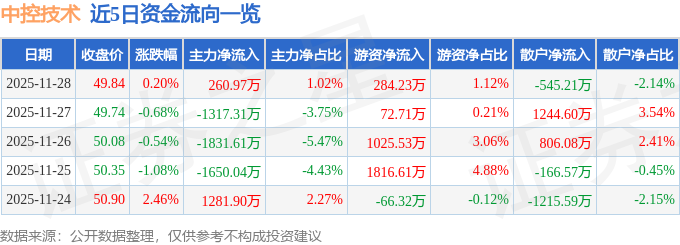 11月28日的资金流向数据方面,主力资金净流入260.97万元,占总成交额1.02%,游资资金净流入284.23万元,占总成交额1.12%,散户资金净流出545.21万元,占总成交额2.14%。