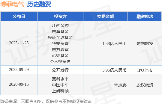 证券之星消息,根据天眼查APP于11月25日公布的信息整理,浙江博菲电气股份有限公司定向增发融资,融资额1.38亿人民币,参与投资的机构包括江西金控,东海基金,兴证全球基金,华安资管,东方嘉富,诺德基金,个人投资者。