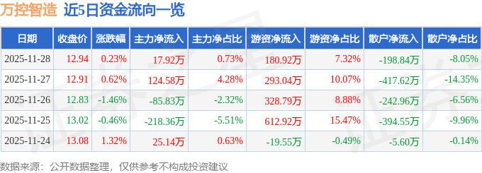 证券之星消息,截至2025年11月28日收盘,万控智造(603070)报收于12.94元,上涨0.23%,换手率0.49%,成交量1.92万手,成交额2471.24万元。