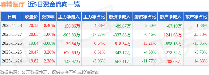 证券之星消息,截至2025年11月28日收盘,奥精医疗(688613)报收于20.13元,上涨0.4%,换手率1.31%,成交量1.79万手,成交额3580.44万元。