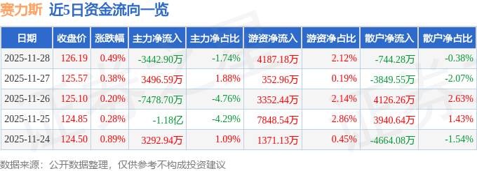 证券之星消息,截至2025年11月28日收盘,赛力斯(601127)报收于126.19元,上涨0.49%,换手率1.04%,成交量15.71万手,成交额19.79亿元。