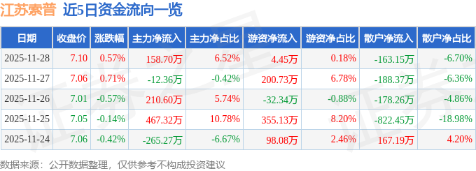 11月28日的资金流向数据方面,主力资金净流入158.7万元,占总成交额6.52%,游资资金净流入4.45万元,占总成交额0.18%,散户资金净流出163.15万元,占总成交额6.7%。
