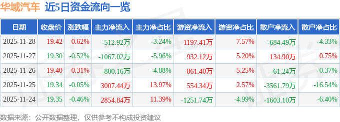 证券之星消息,截至2025年11月28日收盘,华域汽车(600741)报收于19.42元,上涨0.62%,换手率0.26%,成交量8.19万手,成交额1.58亿元。