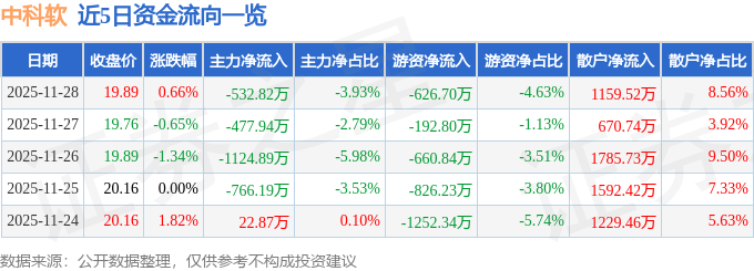 证券之星消息,截至2025年11月28日收盘,中科软(603927)报收于19.89元,上涨0.66%,换手率0.82%,成交量6.83万手,成交额1.35亿元。