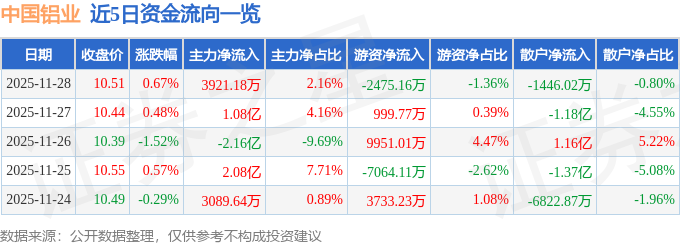 证券之星消息,截至2025年11月28日收盘,中国铝业(601600)报收于10.51元,上涨0.67%,换手率1.32%,成交量173.39万手,成交额18.18亿元。
