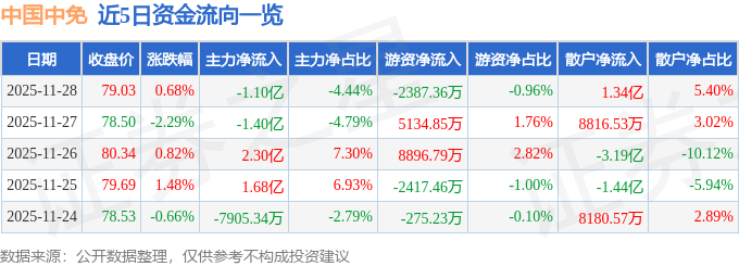 证券之星消息,截至2025年11月28日收盘,中国中免(601888)报收于79.03元,上涨0.68%,换手率1.62%,成交量31.7万手,成交额24.75亿元。