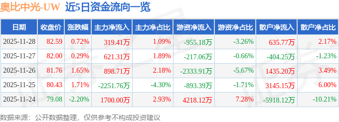 证券之星消息,截至2025年11月28日收盘,奥比中光(688322)报收于82.59元,上涨0.72%,换手率1.22%,成交量3.57万手,成交额2.93亿元。