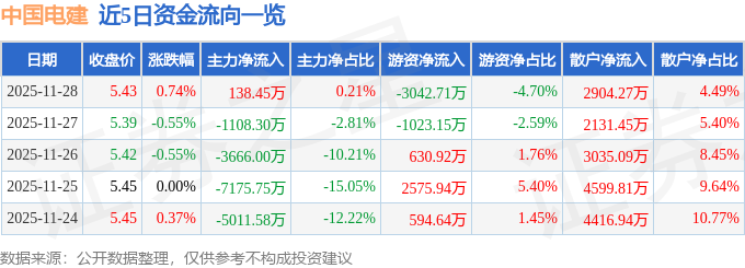 证券之星消息,截至2025年11月28日收盘,中国电建(601669)报收于5.43元,上涨0.74%,换手率0.92%,成交量120.28万手,成交额6.47亿元。
