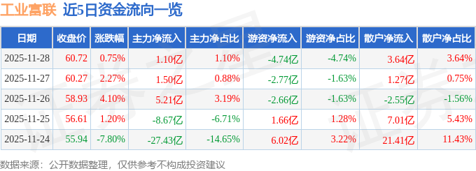 证券之星消息,截至2025年11月28日收盘,工业富联(601138)报收于60.72元,上涨0.75%,换手率0.84%,成交量166.78万手,成交额100.08亿元。
