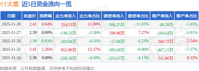 证券之星消息,截至2025年11月28日收盘,ST太重(600169)报收于2.41元,上涨0.84%,换手率0.58%,成交量19.17万手,成交额4591.48万元。