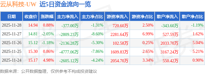 11月28日的资金流向数据方面,主力资金净流出377.0万元,占总成交额1.31%,游资资金净流入720.6万元,占总成交额2.5%,散户资金净流出343.6万元,占总成交额1.19%。