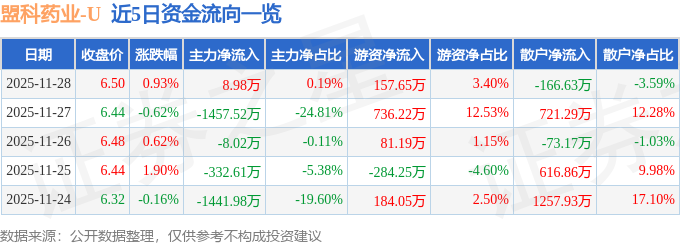 证券之星消息,截至2025年11月28日收盘,盟科药业(688373)报收于6.5元,上涨0.93%,换手率1.37%,成交量7.21万手,成交额4642.22万元。