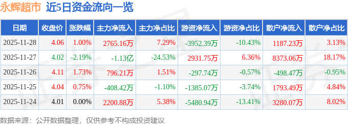 证券之星消息,截至2025年11月28日收盘,永辉超市(601933)报收于4.06元,上涨1.0%,换手率1.04%,成交量94.28万手,成交额3.79亿元。