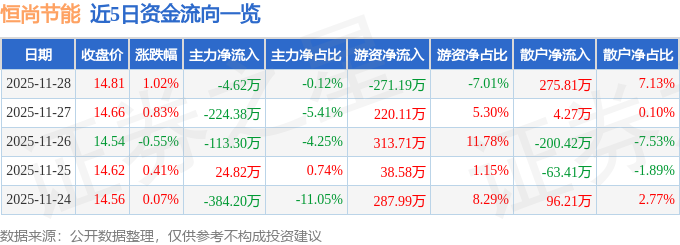 证券之星消息,截至2025年11月28日收盘,恒尚节能(603137)报收于14.81元,上涨1.02%,换手率3.57%,成交量2.63万手,成交额3868.26万元。
