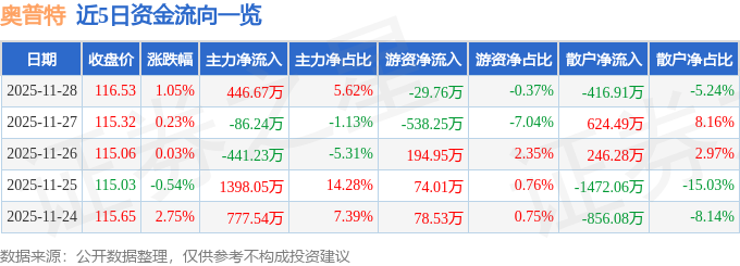 证券之星消息,截至2025年11月28日收盘,奥普特(688686)报收于116.53元,上涨1.05%,换手率0.56%,成交量6840.0手,成交额7953.51万元。