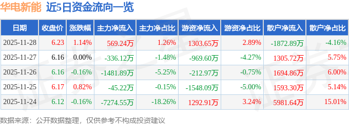 证券之星消息,截至2025年11月28日收盘,华电新能(600930)报收于6.23元,上涨1.14%,换手率2.91%,成交量72.94万手,成交额4.51亿元。