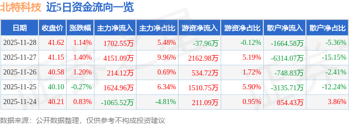 证券之星消息,截至2025年11月28日收盘,北特科技(603009)报收于41.62元,上涨1.14%,换手率2.22%,成交量7.53万手,成交额3.11亿元。
