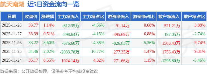 证券之星消息,截至2025年11月28日收盘,航天南湖(688552)报收于33.77元,上涨1.14%,换手率4.63%,成交量4.02万手,成交额1.34亿元。