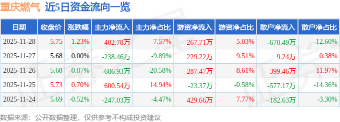 证券之星消息,截至2025年11月28日收盘,重庆燃气(600917)报收于5.75元,上涨1.23%,换手率0.6%,成交量9.33万手,成交额5321.63万元。