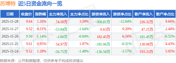 证券之星消息,截至2025年11月28日收盘,苏博特(603916)报收于9.64元,上涨1.26%,换手率0.58%,成交量2.44万手,成交额2342.23万元。