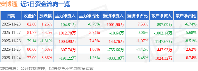 证券之星消息,截至2025年11月28日收盘,安博通(688168)报收于82.8元,上涨1.26%,换手率2.1%,成交量1.61万手,成交额1.33亿元。