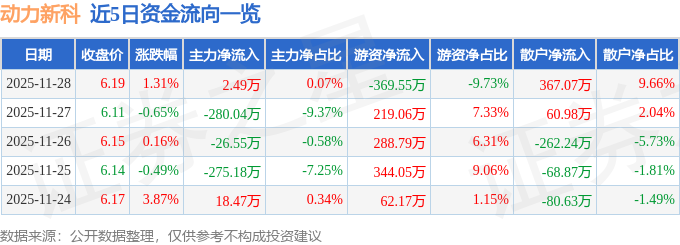 证券之星消息,截至2025年11月28日收盘,动力新科(600841)报收于6.19元,上涨1.31%,换手率0.59%,成交量6.19万手,成交额3798.21万元。