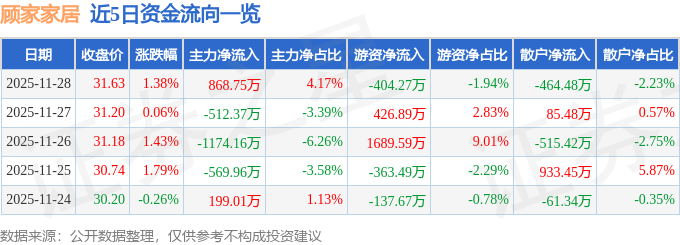 证券之星消息,截至2025年11月28日收盘,顾家家居(603816)报收于31.63元,上涨1.38%,换手率0.82%,成交量6.65万手,成交额2.09亿元。