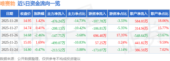 11月28日的资金流向数据方面,主力资金净流出476.24万元,占总成交额14.73%,游资资金净流出107.78万元,占总成交额3.33%,散户资金净流入584.03万元,占总成交额18.06%。