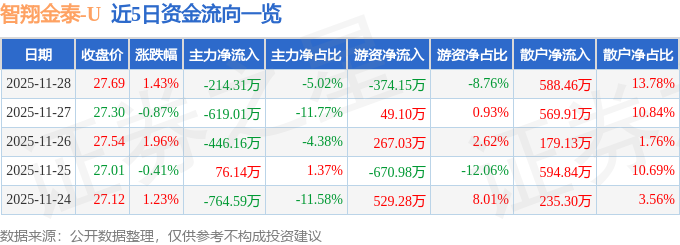 11月28日的资金流向数据方面,主力资金净流出214.31万元,占总成交额5.02%,游资资金净流出374.15万元,占总成交额8.76%,散户资金净流入588.46万元,占总成交额13.78%。