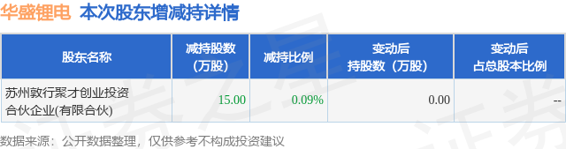 证券之星消息,11月28日华盛锂电发布公告《华盛锂电:江苏华盛锂电材料股份有限公司关于股东减持计划完成暨减持股份结果的公告》,其股东苏州敦行聚才创业投资合伙企业(有限合伙)于2025年11月28日合计减持15.0万股,占公司目前总股本的0.094%,变动期间该股股价下跌3.5%,截止11月28日收盘报111.8元。