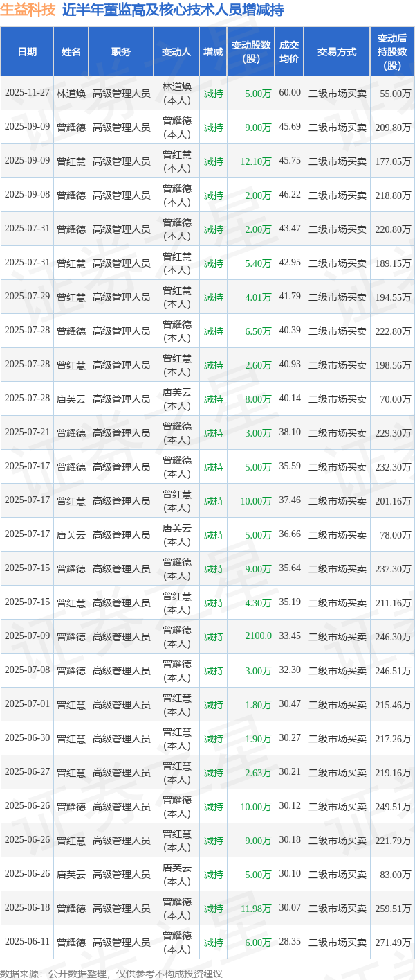 生益科技近半年内的董监高及核心技术人员增减持详情如下: