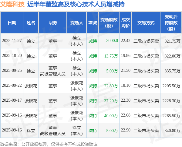 艾隆科技近半年内的董监高及核心技术人员增减持详情如下:
