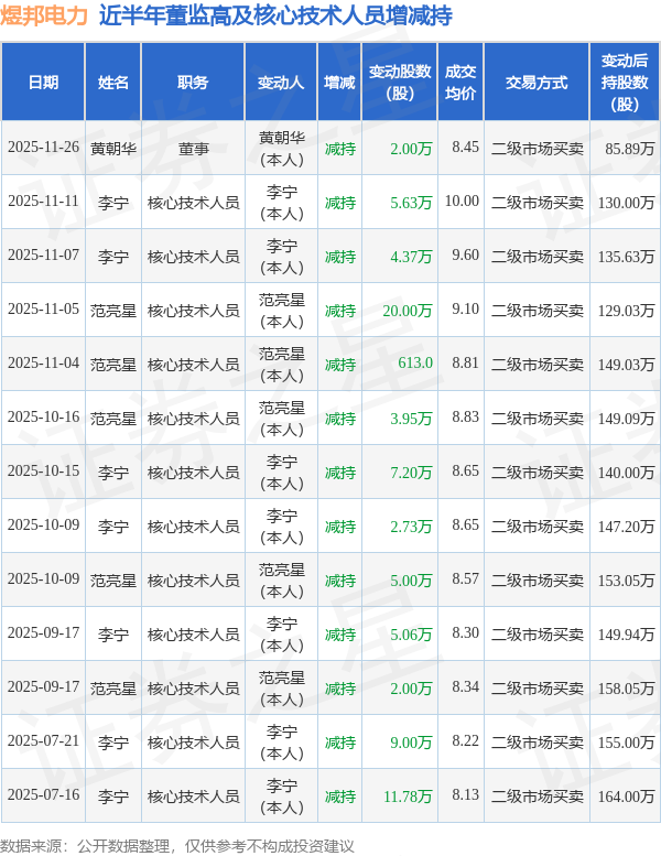 煜邦电力近半年内的董监高及核心技术人员增减持详情如下: