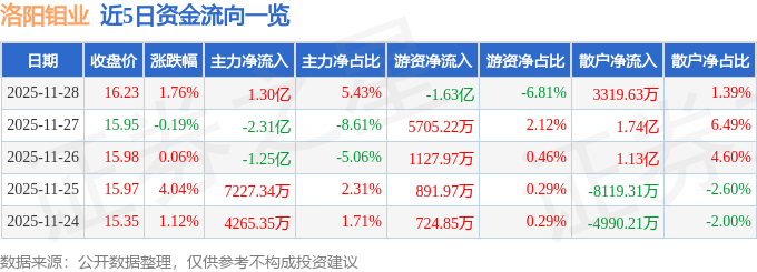 证券之星消息,截至2025年11月28日收盘,洛阳钼业(603993)报收于16.23元,上涨1.76%,换手率0.85%,成交量148.07万手,成交额23.91亿元。