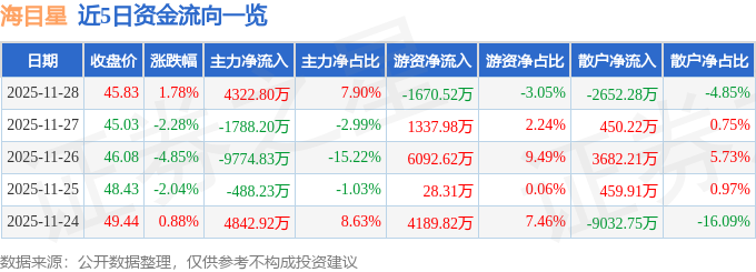 证券之星消息,截至2025年11月28日收盘,海目星(688559)报收于45.83元,上涨1.78%,换手率4.81%,成交量11.91万手,成交额5.47亿元。