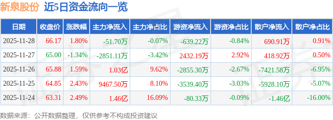 证券之星消息,截至2025年11月28日收盘,新泉股份(603179)报收于66.17元,上涨1.8%,换手率2.28%,成交量11.65万手,成交额7.6亿元。