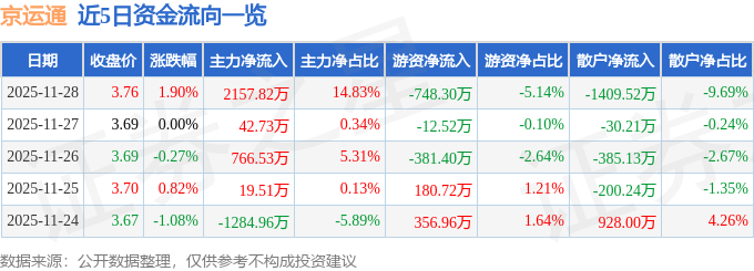 证券之星消息,截至2025年11月28日收盘,京运通(601908)报收于3.76元,上涨1.9%,换手率1.61%,成交量38.98万手,成交额1.45亿元。