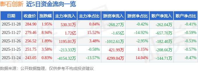 证券之星消息,截至2025年11月28日收盘,影石创新(688775)报收于284.9元,上涨1.95%,换手率7.39%,成交量2.25万手,成交额6.32亿元。