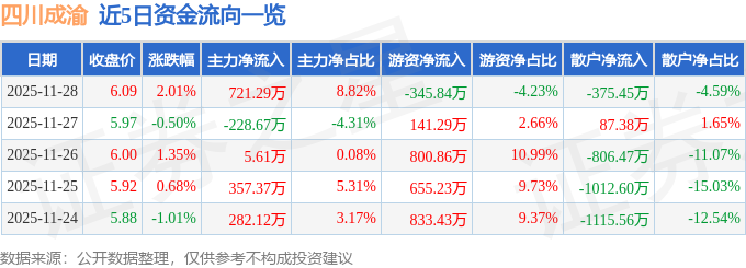 证券之星消息,截至2025年11月28日收盘,四川成渝(601107)报收于6.09元,上涨2.01%,换手率0.63%,成交量13.53万手,成交额8180.12万元。
