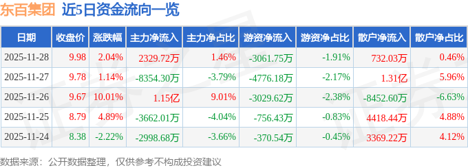 证券之星消息,截至2025年11月28日收盘,东百集团(600693)报收于9.98元,上涨2.04%,换手率19.02%,成交量165.26万手,成交额15.99亿元。