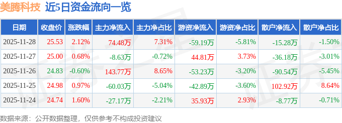 证券之星消息,截至2025年11月28日收盘,美腾科技(688420)报收于25.53元,上涨2.12%,换手率1.18%,成交量4033.0手,成交额1018.66万元。