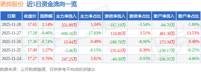 证券之星消息,截至2025年11月28日收盘,诺邦股份(603238)报收于17.65元,上涨2.14%,换手率1.51%,成交量2.69万手,成交额4716.63万元。