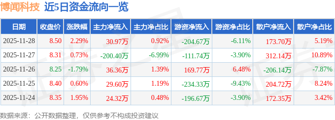 证券之星消息,截至2025年11月28日收盘,博闻科技(600883)报收于8.5元,上涨2.29%,换手率1.69%,成交量4.0万手,成交额3349.9万元。