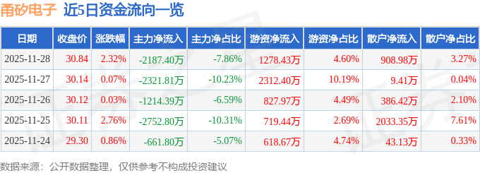 11月28日的资金流向数据方面,主力资金净流出2187.4万元,占总成交额7.86%,游资资金净流入1278.43万元,占总成交额4.6%,散户资金净流入908.98万元,占总成交额3.27%。