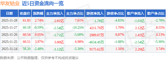 证券之星消息,截至2025年11月28日收盘,华友钴业(603799)报收于61.83元,上涨2.74%,换手率3.18%,成交量59.98万手,成交额36.96亿元。